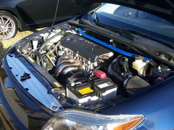 OBX RACING HEADERS, CUSTOM tC STRUT BAR, CUSTOM tC DIVERSION PANEL, AND INJEN SHORT RAM COLD AIR INTAKE