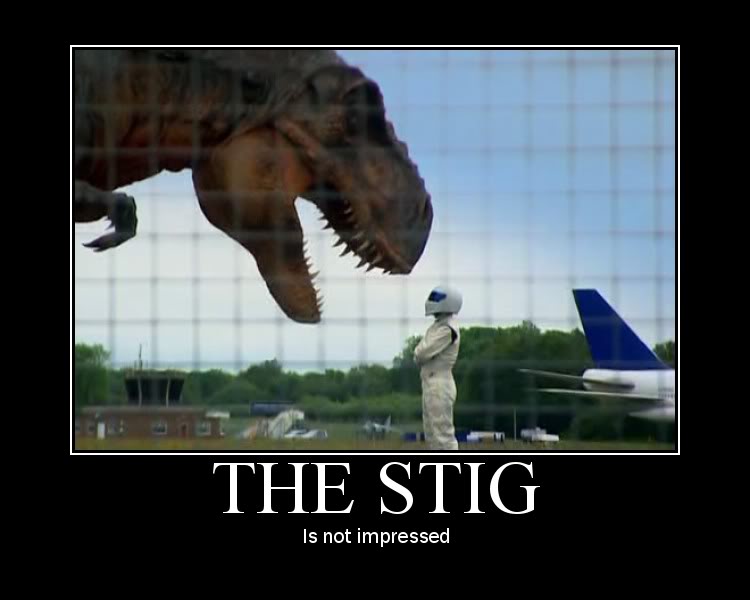 my fav stig moment was when he was driving the lotus 7 and he got pulled over by the cops. They asked him for his lisence and registration and he just kepted look at them.