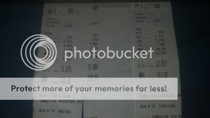 And on my 3rd and final pass I ran a 11.68 @ 118. Here is a pic of all 3 of my time slips.