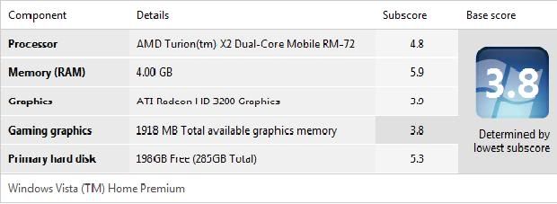 My computer at home has 8GB ram, 1.6GB worth of video memory, 1TB hard drive and my score is like a 5.7 lol. My processor is what hurts me but still, a 5.7?! |