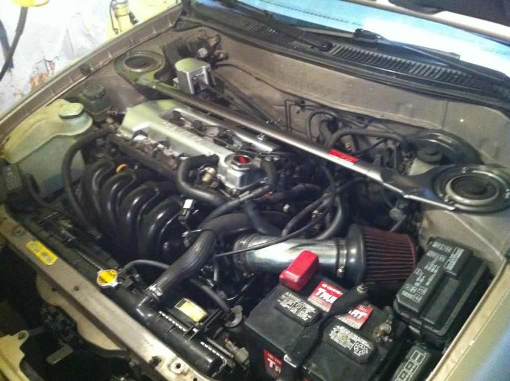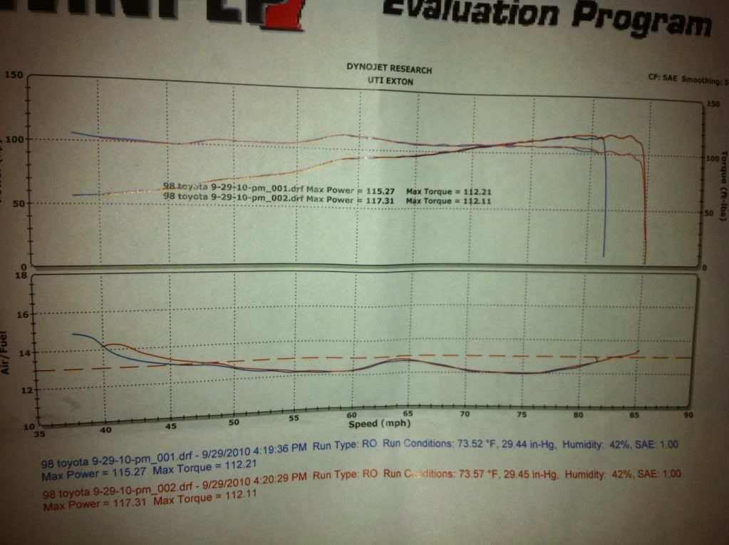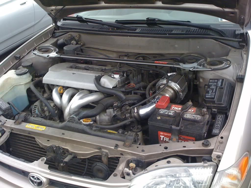 started out about 4 years ago. dad got me this corolla. not a bad piece of machinery. had 131k, steelies, no foglights and looked like a grandma's car. at least it was manual. soon as the car got home wheels got put on it. took care of foglights the next day.(more recent shot) ![]() Few weeks goes by and i decide the silence is to much so i buy a intake from Weapon-R. not the best design but i didnt/dont care. that sufficed until i started going to U.T.I and felt lacking in the mod department. Went to a school sponsored trackday ran a 17.22. also my first time at the track. at 163k mileshttp://s226.photobucket.com/albums/d...Movie_0003.flv ![]() So halfway through this year i started dropping some coin into my car starting with my faux jap plate which is some like others dont. ![]() Got an exhaust ![]() Strut bar and Oil cap from TRD ![]() and the last mod: a plastic Intake Manifold W/ bigger throttle body and intake as far as performance bolt-ons go, i just wish there were more for these cars. currently 181K miles ![]() Update 1: this dyno was Intake/Exhaust and 173k miles. car continues to impress. expected way lower. (also i find turn your head slightly makes the lines more visible)