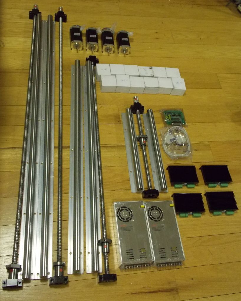 I purchased the plans off Ebay from a company called http://www.pdjinc.com I got the plans in the mail Saturday, and immediately started looking through the CD. It is quite helpful, but to be honest, it isn't very well organized. A lot of the information can be found by simple research. It is a good reference though. Since my father is a custom wood worker, I wanted it to be large enough for cabinet doors. So I decided that my over all table dimension will be about 1400mm X 1000mm with a total work space of approximately 42"x31". Z travel will be about 6". Since I am making a larger machine, I'm beefing everything up. I'm using 25mm fully supported linear rail bearings, and 16mm ball screws. The plans had me using smaller rails. I'm very excited to get this project rolling! I'm going to order most of the parts this week, and then this weekend I'll be able to stop at the scrap yard and get some aluminum for the table and main body of the router. I'll be using heavy duty T-slot extrusions. I'll probably pick a bunch of stock lengths up and make some storage shelves as well. PARTS LIST 1 SFU1605-450mm with nut (Z-Screw) 1 SFU1605-1000mm with nut (X-Screw) 2 SFU1605-1300mm with nut (Y-Screws) 4 end machine (For the stepper motor) 4 BK/BF12 (Stepper motor couplers) 2 SBR25-1225mm (Y-Rail) 2 SBR25-925mm (X-Rail) 2 SBR25-375mm (Z-Rail) 12 SBR25UU (Bearing Trucks) 4 NEMA 23 Stepper Motor 425oz.in 4 Microstep Drivers 2 Power Supply Boxes 1 Breakout Board 1 Data Cable Everything arrived and looks great! Time to start laying this out in CAD so I can properly build this.