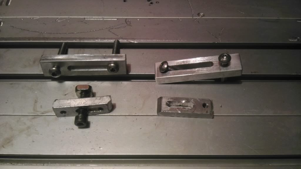 More fun today! Made my first cuts in aluminum. I need to make some more upgrades before I go much farther with alum. I made new table clamps since the ones that came with the machine were trashed. They came out quite nice after 2 trial and error runs!
