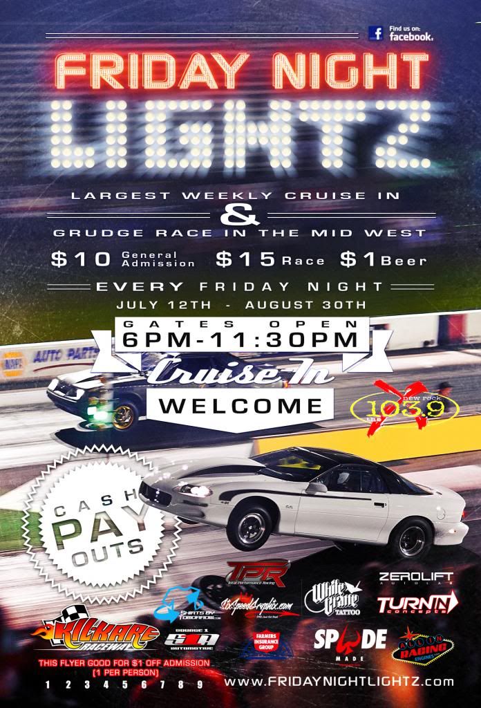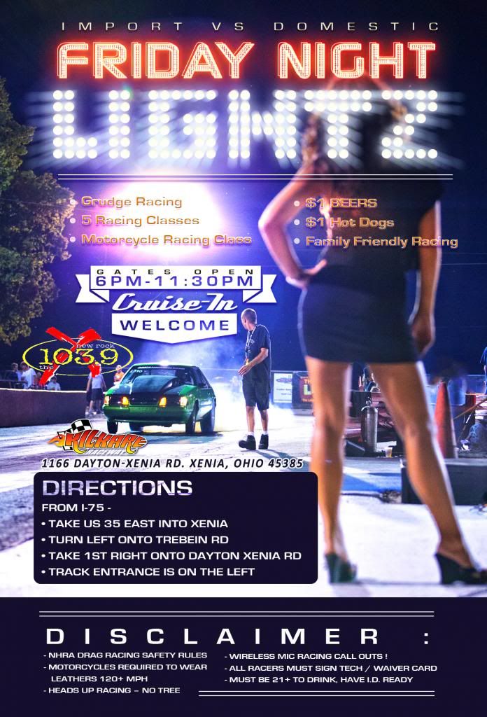 ![]() ![]() 2013 - Friday Night Lightz - Info, Rules, & Tech Schedule for Friday Night Lightz: STARTS JULY 12th ! 6:00 PM - Gates Open 7:00 - 9:15 Heads Up Racing 9:15-9:30 MANDATORY drivers meeting and vehicle staging 9:30-11:00 Knight, Prince, and King of the Streets Contest 11:00pm - Racing over… Lanes closed Times may be modified by event staff as necessary. WHERE: Kil-Kare Raceway 1166 Dayton Xenia Road Xenia, OH 45385 (937) 429-2961 ENTRY / PRICING INFO: -Spectator - $10.00 a person … -Kids 12 and under are free! -Racer - $15.00 **We will be Popping Trunks at random at the entry gate .If you are caught Smuggling People in your trunk. You will be asked to leave** **Must be 21+ to Drink alcoholic beverages** **Alcoholic beverages are not permitted to be brought onto the premises - You may be subject to search at the gate – If you are caught bringing alcohol onto the premises it will be confiscated. **No glass bottles. **No alcoholic beverages permitted in the racing lanes or with crew on track at any time** **No reckless driving/burnouts permitted in the staging, parking or pit areas. Violators will be ejected. **ABSOLUTELY NO DRINKING & DRIVING OR DRUG ABUSE AT ANY TIME** **Cell phones are not to be used while on Race Track Surface** ** All in attendance must keep the TICKET provided at the front gate ** *** If any of the above rules are broken, you will be asked to leave the track premises ... *** King’s Throwdown, King of the Streets, Prince, & Knight of the Streets, Bikes Contest INFO: Bike Class : Knight of the Streets : Class for 13.00 and Up Class will be run on the ¼ mile Prince of the Streets : Class for Cars 11.50 to 12.99 Class will be run on the ¼ mile King Of The Streets: Heads up class, fastest ET Wins Class will be run on the ¼ mile Bike King of The Streets: Heads up class, fastest ET Wins Class will be run on the ¼ mile King’s Throwdown: Heads up class, fastest ET wins. Class will be run on the 1/8 mile. **A Mandatory Drivers Meeting will take place before the start of racing; please make sure you are present** ** Roll Racing will not be Allowed, ALL Racing is Heads Up Style ** All races will be started by hand drop, the tree WILL NOT be used. Leaving before the starter drops their arms results in an automatic loss. ** A minimum of 2 spotters will be on track during all elimination rounds to watch for jumps and any other violations that will result in an instant loss (lights on, crossing the center line, etc.) ** Only one vehicle per registrant is permitted, may only register in one race class. * Cars must drive on and off of the Track surface under their own power. No Pushing, Towing unless the vehicle is broken. Jumping a car at the starting line will result in a Disqualification. **CLASS RACE SCHEDULE: Knight - Prince – Bike - KOTS – King’s Throwdown Each Class will run ONE round - giving time break between elimination rounds ** During eliminations all vehicles must return immediately to the staging lanes. Vehicles may not return to their pits during eliminations: All fueling/bottle changes/tire pressure changes/etc. must be done in the staging lanes. Any violations will result in disqualification. ** Drivers must be by their cars during the elimination rounds, this will keep things moving. ** if you are not in your car and ready to race when it is time for you to be pulled out of the staging lanes you will be disqualified. ** For all King’s Throwdown & King of the Street elimination rounds, car numbers will be drawn out of a hat. A track worker will draw for and assign lane choice. At the event staffs’ discretion after the draw vehicles may be put into a bracket and run through the bracket for eliminations. ** ALL King of the Street/King’s Throwdown competitors may be granted ONE 5 Minute maintenance break each during the Elimination Round if needed. Must notify Race Official that a break is needed. ** If you have not shown up by the time the 5 minute are over you will forfeit the race.. ** 10 min cool down will only be allowed for the last 3 KOTS Runs ** Negotiations only allowed for the FINAL (best of 3) Races in Bike, KOTS and King’s Throwdown only. (If no negotiation has been agreed upon within the 10 Minutes, an event official will decide the outcome) ** Anyone who is not staff will not be permitted on the track at any time. (unless permission granted)** ** A maximum of 2 crew members will be permitted on the track for King of the Streets** If more than 2 crew members are on the track the result will be a forfeit/loss for the offending team/driver **Badges will be available for 2 crew members per kings contestant **Once each race is completed, that Crew must exit the track until the car and driver return to the burnout box. **Anyone found using a G-Tech or other performance meter during eliminations will be disqualified from the event immediately. ** ALL RACERS MUST FOLLOW THE RULES. IT IS YOUR RESPONSIBILITY TO KNOW THE RULES AND FOLLOW THEM** -All persons who race in King of the Streets and do not win will be refunded their racing fee. NOTE : For ALL Racing Classes – *In the event of a weather or track conditions event cancellation occurring prior to Finals or not being able to finish eliminations due to time constraints; the class winnings will be carried over to the following week! VENDOR INFO: **We welcome any and all Vendors or Shops in the Tri-State Area to participate in this event. Please contact us to set up Booth Space. **If you have any questions, comments or concerns, Please contact us at 513-874-2508** FRIDAY NIGHT LIGHTZ GENERAL TECH : General Tech: **Vehicles must be able to pass tech inspection as per current NHRA Rulebook. **All racers under age 18 must have signed parental consent. **Helmet required for 13.99 and under and all convertibles **Roll bar and helmet required for 11.49 and under except for cars meeting NHRA 2008+ manufactured vehicle requirements **Roll Cage required for all vehicles running 9.99 and