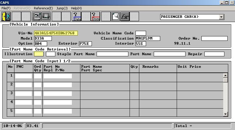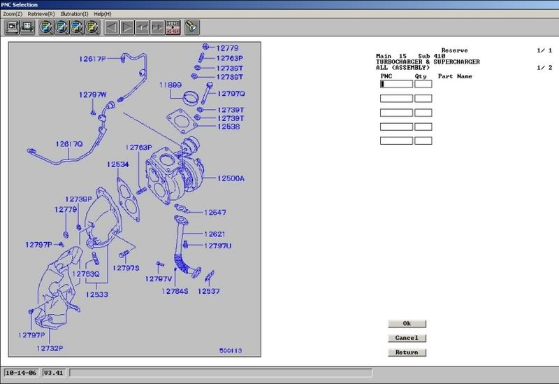 First off, it can be downloaded from here: http://www.stealth316.com/2-wincaps.htm Secondly, I'm going to do my best to explain how to use it. Say you needed new Turbo Bolts for your 2G turbo DSM. You're going to need a VIN number for the type of car you need a part number for. I usually go to Autotrader.com and find a similiar car and use their VIN number since I usually don't have my VIN number handy. Enter in your VIN number in the box next to where it says "Vin-No" and hit enter. The double-click in the empty box next to where it says "Illustration." I highlighted both in yellow: ![]() That will then bring up this screen: ![]() You then double - click on the Number for the section your part is located in. Since I am look for Turbo Bolts, I'm going to click on 15 - Intake and Exhaust. This will then bring you to several Sub-Groups. (If you look in the top right hand corner you will see it says "1/1". That means there is only one page of diagrams for this group. Sometimes there will be more then one page and in that case you will use the arrows in the top middle to switch over to the next page.) I double-click on Sub Group 410 - Turbocharger to find the part number I need. This then brings you to a diagram that looks like this: ![]() I then click on the number for the part I need. Turbo Bolts would be 12797Q. I hit OK at the bottom right and this then brings you back the the Main CAPS screen and tells you the Part Number for this part. It also tells you how many of these total are used on the car under "Qty" [Note: Double clicking the number on the diagram will automatically bring you to the main screen without having to click OK. Clicking on it just once will allow you to select more then one part before having to go the main screen]. If you want to go back to the same Sub-Group you were just in, double click in the second box next to where it says Illustration. If you double click in the box directly next to where it says Illustration, it'll bring you back the main group. After all this is completed, I usually then head on over to MitsubishiParts.net and type the part number into their Search to see how much this part is going to cost me. Well, I hope this helps. Let me know if you have any questions on how to use it