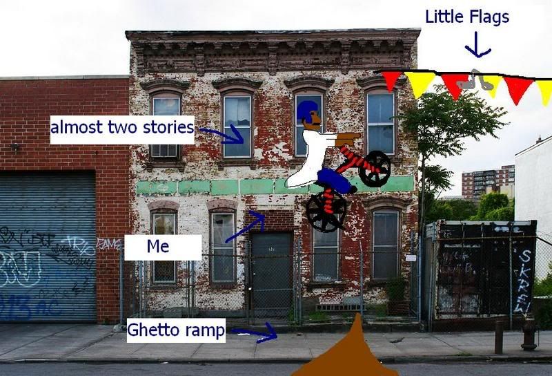 Once when I was about ten some friends ghetto rigged a bike ramp and dared me to jump it. I was like no problem, so I see them step back a little and jump and land it no problem. I wanted to go big so I went to the other end of the block and pedaled as hard as I could, I'm talkin speed racer pedaling. SO I'm going and all of a sudden I hit the ramp and nobody told me it was that steep on the other side of the ramp. I basically go straight up in the air almost two stories, no Lie like where the little flags are between the row homes. From that point I don't remember the drop just the fall and it was BAD! No broken bones thank God but my chin hit the handle bars, the fork was bent, the front tire blew, my knee was skinned to bone and my mouth was bleeding. This was some stuntman Sh** gone wrong but I got up and dragged my bike home with all of my alleged friends laughing at me and a bike which I had to explain to my parents how I broke. I wish I could do it again though. Lol