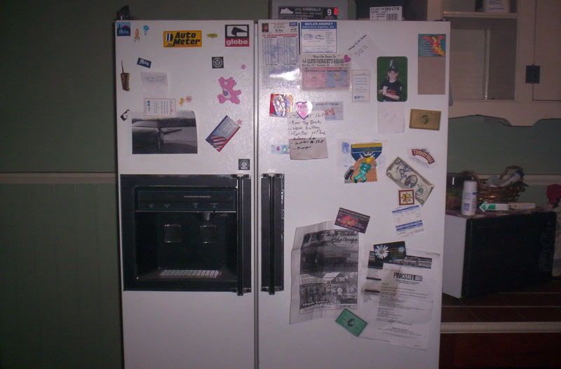 and since those guys would rather pretend they know stuff about cars than have fun...i figured maybe we'd get some fun out of it over here. so yeah... mine just kinda collects the random things that 20 year old guys find. theres: -the black and white picture of the probe pre-boost -my little brother...i guess my mom put that there when she was here sometime -flyers about local dragstrip events -a to do list for one of our cars -the badass bowling clip that yells strike! when you open it -the $2 bill someone got with a quote written on it -magnets that come with credit card offers that im too smart to accept -my water bill (thats odd) -stickers that come with clothes -oh and that stupid ice maker that doesnt work. - a pink care bear... someones girlfriend mustve gotten to it. -etc.. and you can see my brothers new disgusting habit ![]() lame.... yes, but the camera was right in front of my when i read it over there. and i have no use for a picture of my refrigerator. so i figured id make some of it. -Later