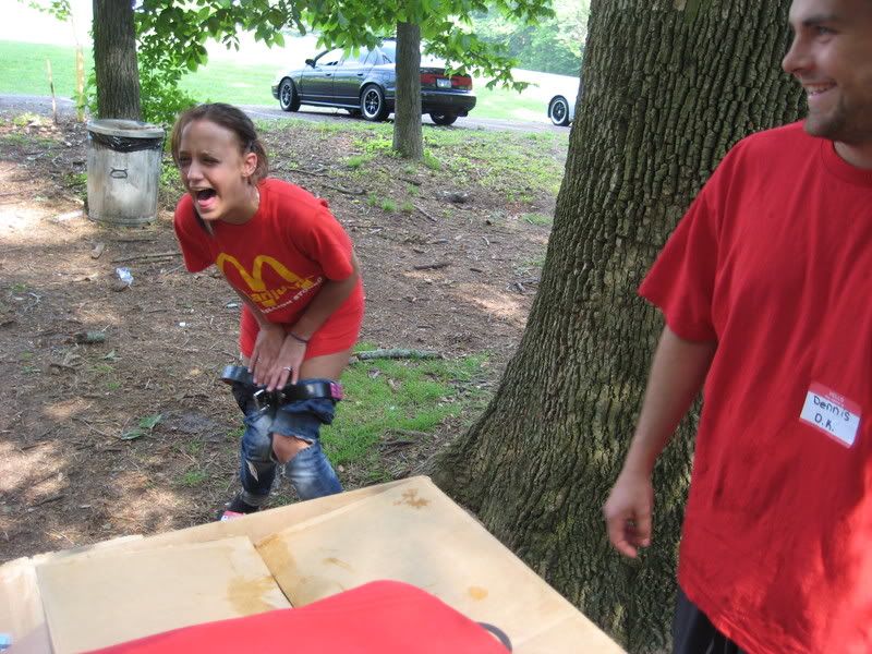 ![]() Mark(?) modeling the thong and booty shorts while looking for Troll. ![]() Beth also showing off her booty shorts. ![]() And again, only with a bit of style. ![]() Long story short, Dennis put ice down her pants and she tried to hide while stripping to get it out. He moved to the side and told me to get a picture. ![]() As she's running away. ![]() Dennis caught her and poured more water on her. ![]() After she ran to the car and got changed from all the water Dennis put on her. Looking quite happy. ![]() Still looking happy. ![]() A forced booty short shot from Dennis! ![]() Not sure who that is. Playing king of the tire pole and trying to knock him down? Not sure. I captured his glory moment.