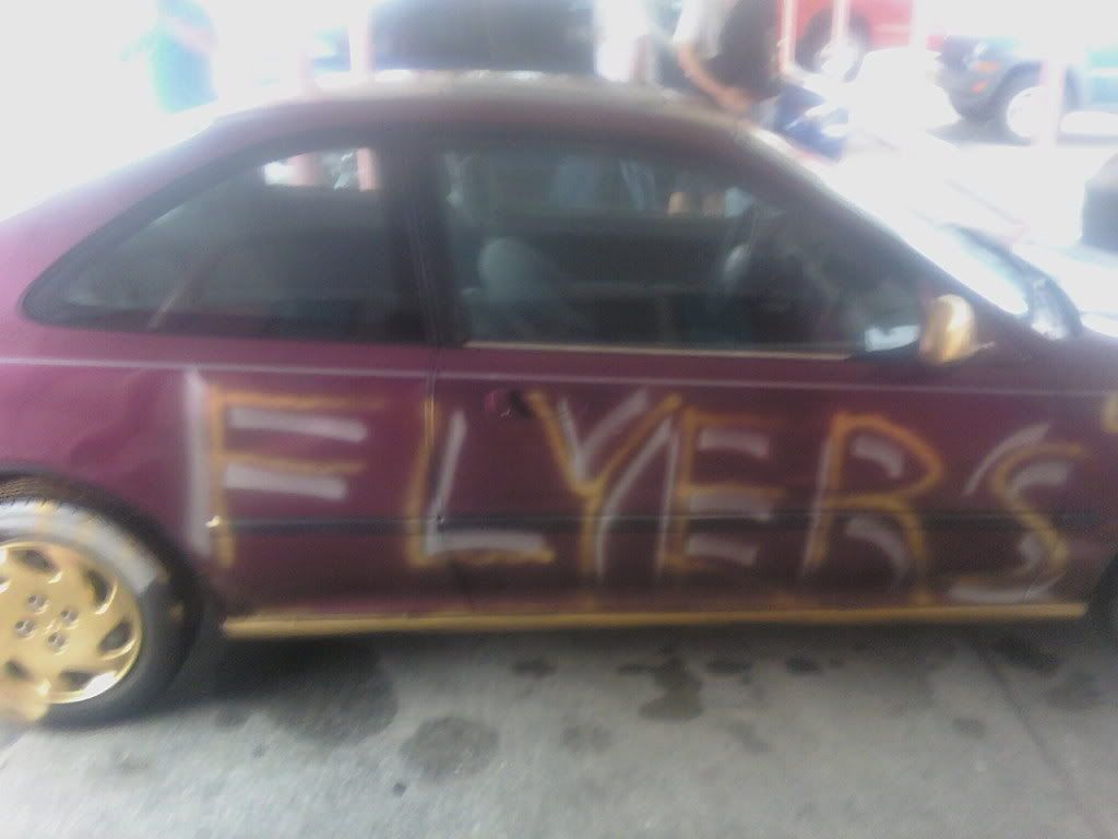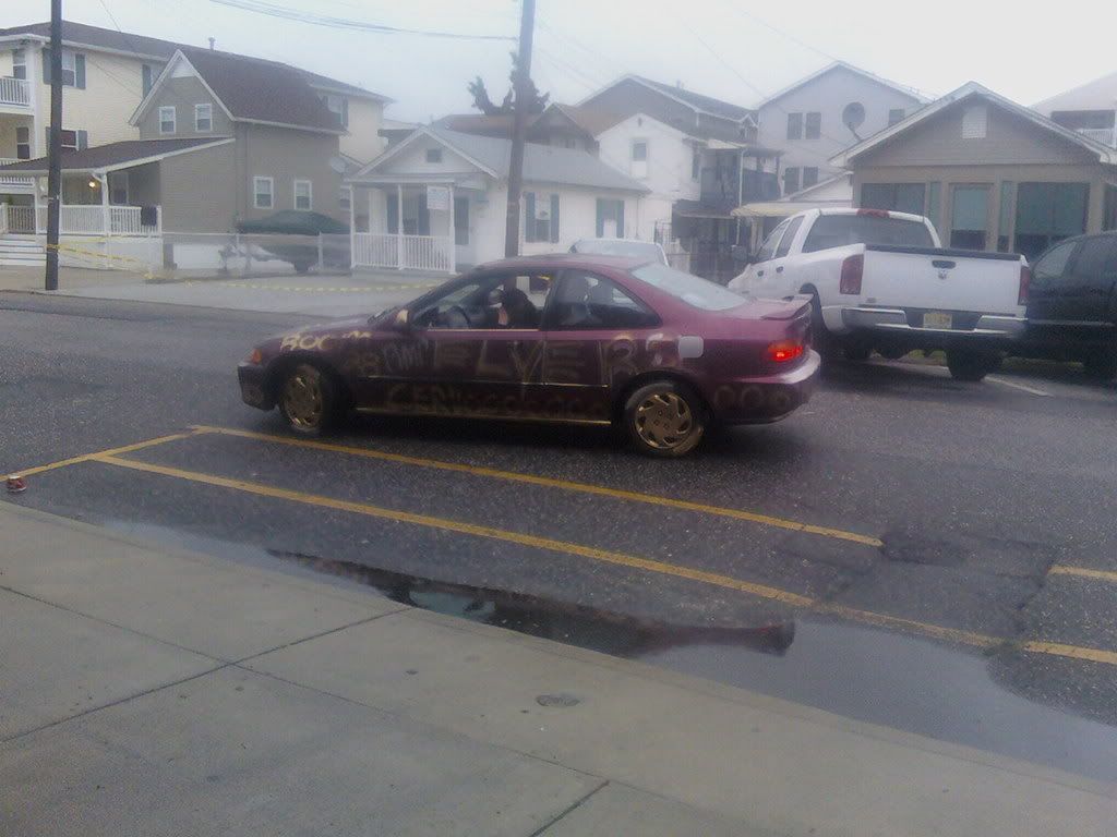 Wildwood car show, rain-out, flyers comming on, gold and silver paint, toms the only one with a beater, Do work. haha no other explaination we were drunk and always do stupid **** down wildwood.