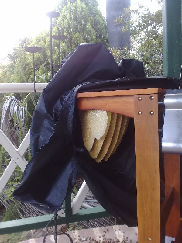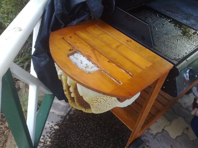 So I'm using my bbq this weekend... So I thought ill clean it up.. I have known there were bee's coming from under the cover so I thought I'd kill them, obviously... So heres the bbq in question Now I know these bombs aren't for bee's and that but I thought I'll suffocate/smoke them out. So here is the weapon of choice and delivery system. I thought I was pretty smart hehehe designed to be easierly manovered under the cover of darkness... So then I release the weapon of buzz destruction.. OMFG! The sound from under the cover was incredible!!! You could hear it 3m away easy... Then I ran like the clappers.... Coming back few mins later to see the death toll... I continued to remove the cover and to light the bbq to give it a clean when I noticed some fattly looking substance on the top of th side shelf thing.... Bit weird.. I clean it before I put it away for winter and no way was there fat there so I begun to wonder...... NO..... It can't be could it? I slowly removed the rest of the cover only to find the HQ.. ![]() ![]() ![]() ![]() ![]() ![]()