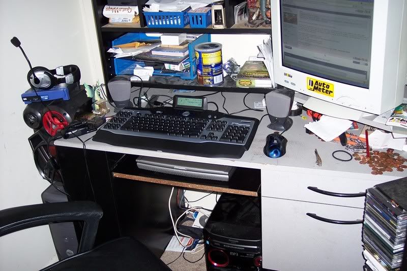 2.66ghz p4 1gb 333 DDR Original R9800 Pro. (not that new crap) 250gb HDD G15 MX510 Soundblaster Audigy2 Harman/Kardon 2.1 set. (It's basically still an oldschool Dell 8300 with some addons. No money to build the one I want) Lappy (tuning computer/IM): 2.60ghz Celeron 512mb SDR (Again, pretty much a Dell Inspirion 1150 with extra ram. No money to get something better, haha) Yes, it's all hooked into that stereo underneath.