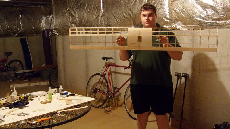 Here is the wing for my current plane I am building. You can see the bike behind me and in the far corner you can see two more planes. In between the planes is a box with two R/C cars.