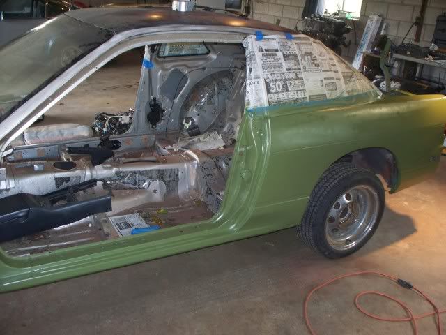 Last weekend my buddy finally had some time to come by and finish welding the floor/frame. It took alot longer then we had expected, the hardest part was the floor since we had to remake part of the rocker and pinch weld. During the week I tried to install the power steering lines only to find that where they hook to the rack stripped out, so after doing some searching on craigslist I found someone local parting out a 240, ended up picking up the rack, a set of teardrop rims and a piggy lip for 60 bucks. I already had the motor reassembled so this past weekend me and my girl really hauled ass and pretty much finished the car, motor, tranny and rear are in along with the interior being about 95% done (just have to install the heater controls) The only bad thing is sunday we tried starting it, all it does it crank, we have fuel and spark but wont fire, so I'm stumped on that part. Well here are some pics passenger side frame ![]() Drivers side ![]() Floor/Rocker/Pinch weld ![]() As a reminder this was the hole from the inside ![]() Finally in its home ![]() The bumper that the lip came on is beat beyond hell... but I like how it looks ![]() ![]() Most of the interior in ![]() And a little parting shot