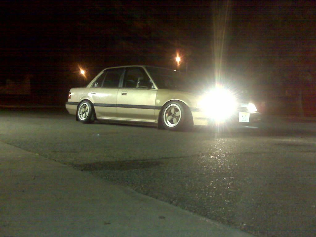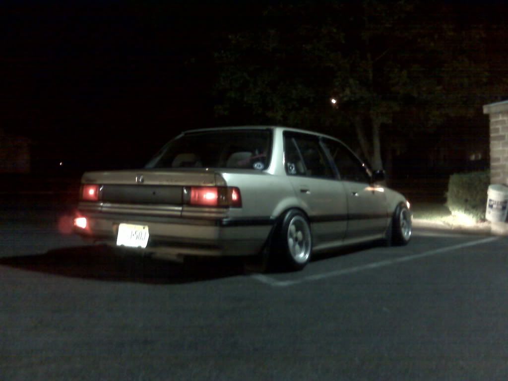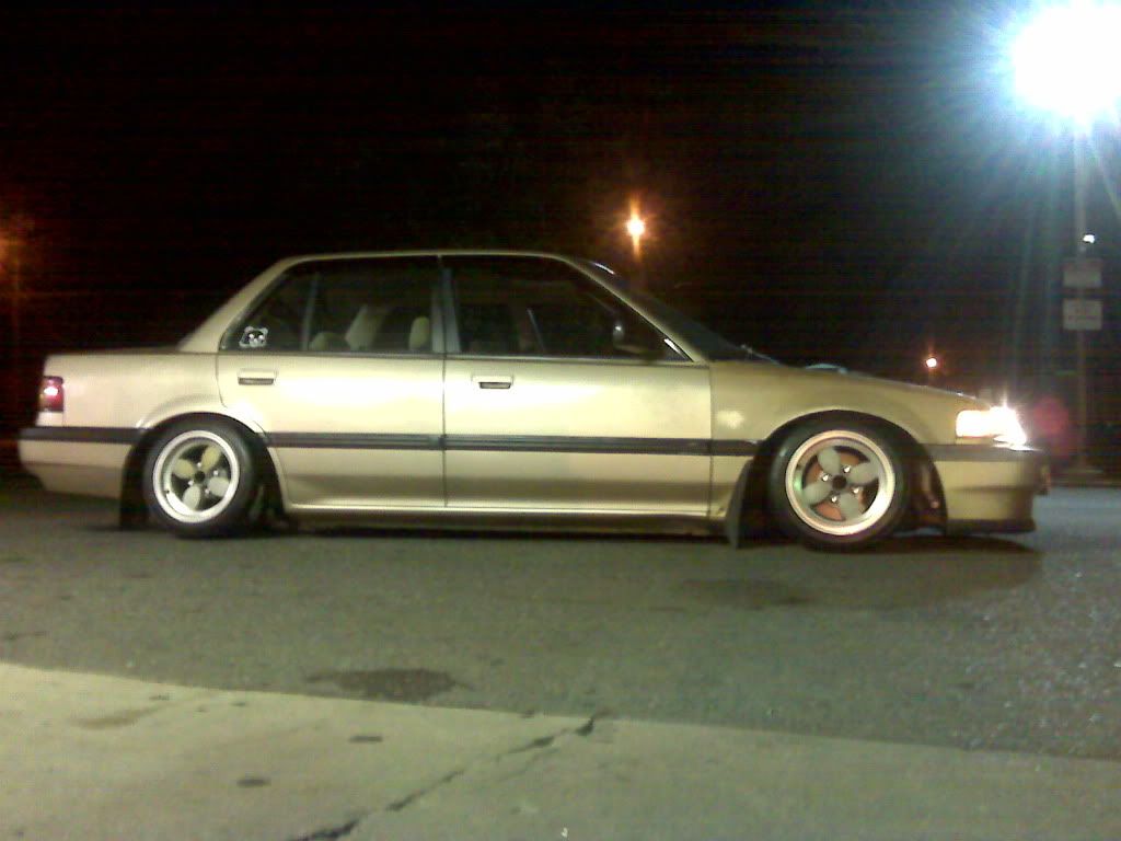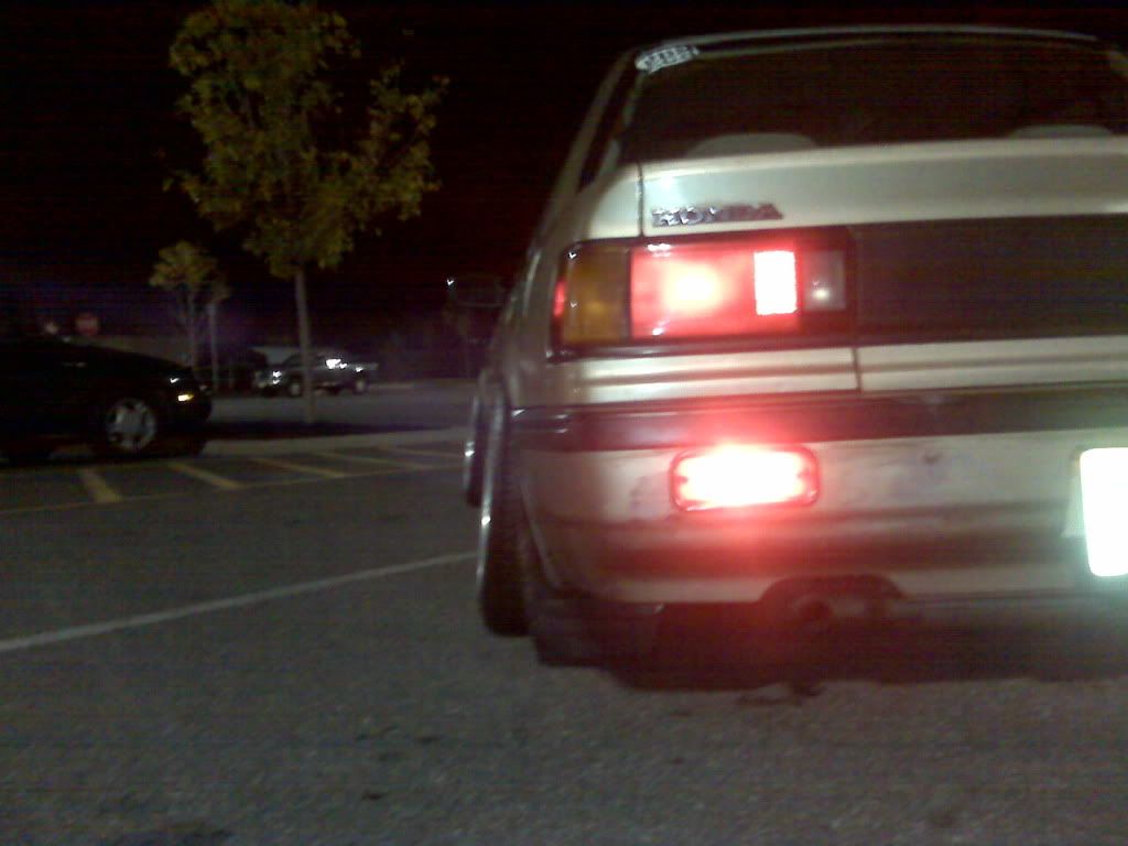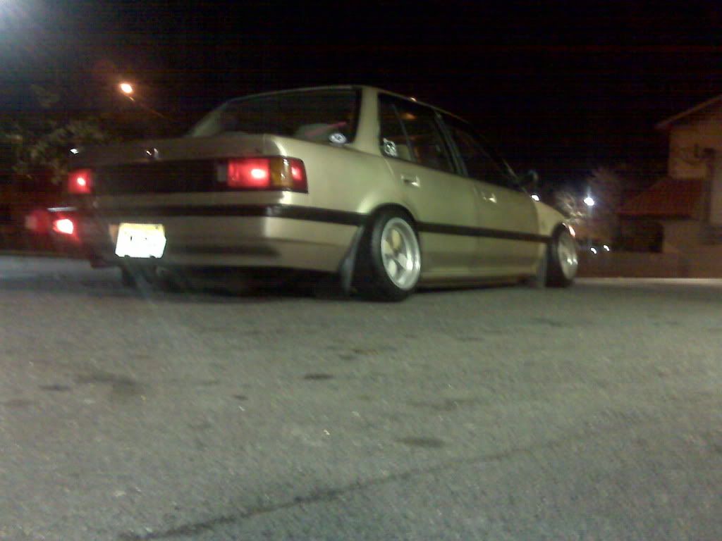 well i haven't been on here in a little while. i have a few pics from last night. i just picked up a set of old american racing "pilones" wrapped in 175/50/13's. wheel specs are 13x7.25 on a 1 1/4 inch 4x100 to 4x114.3 conversion adapter. i got the car's jacking points to sit an inch off the ground just to get to see what it's like to drive at that hight and it's not that bad. i guess i'm just used to it. it will be sitting like this for a month or so until it begins to snow.the wheels will be coming off and it will be going to stock hight. my other wheels are being redrilled to 4x100 and wont be going on untill next season and my hardwear comes in. the car will be getting body work and paint around january. door jams and trunk will be getting a respray anlong with the body in the same color, but i'm still thinking if i want to reskin the roof to not have the non-oem sunroof. the car is getting some progress, it's slow but it's coming along. stay tuned for more.