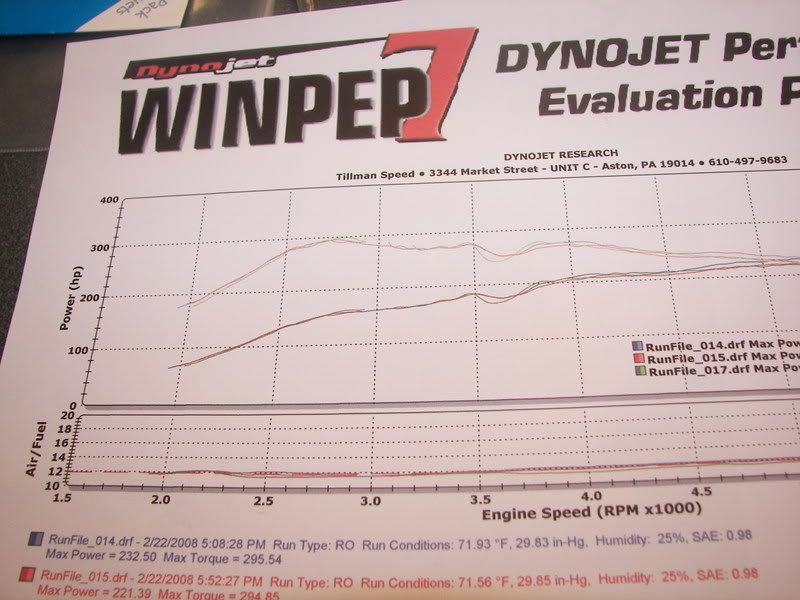 CR at Tillman worked his ass off and came up with a great reliable air fuel, and perfect driving manors. It put down 233hp and 296tq I am expected to go back when I am free again and we are gonna do two last pulls exhaust open versus closed and do them with no load bearing on the car, so that will prolly put me in the range of about 250 hp....