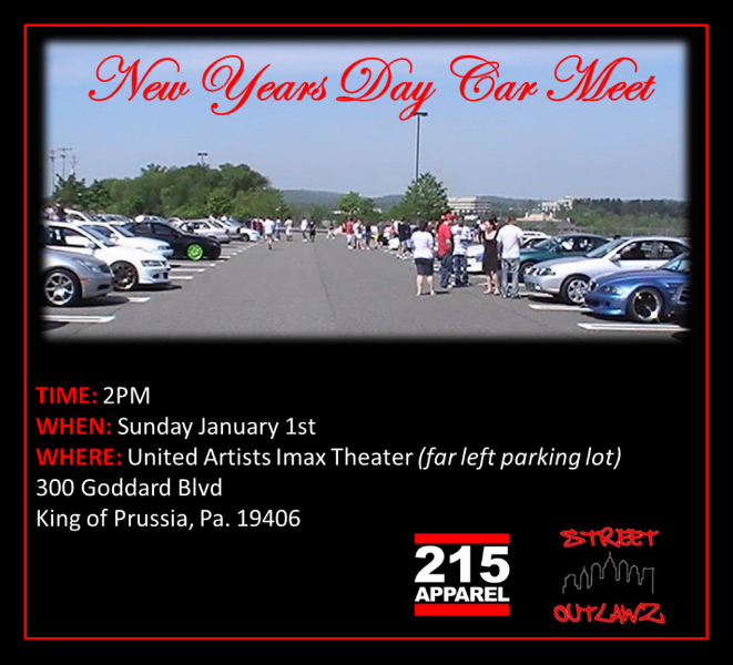 ![]() Sunday is going to be a beautiful 55 degrees & sunny! We are having an all makes and models car, truck & motorcycle meet hosted my Street Outlawz, TST & www.215APPAREL.com #PhillysDopestClothing We expect a BIG turnout as always. The meet is expected to run from 2-330/4pm and we may go on a short cruise through Valley forge park for photos after the meet. TIME: 2PM WHEN: Sunday January 1st WHERE: United Artists Imax Theater (far left parking lot) 300 Goddard Blvd King of Prussia, Pa. 19406 No butnouts or dumb ****... We can go somewhere else for that!