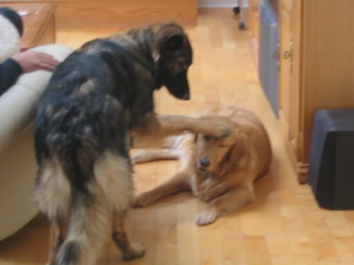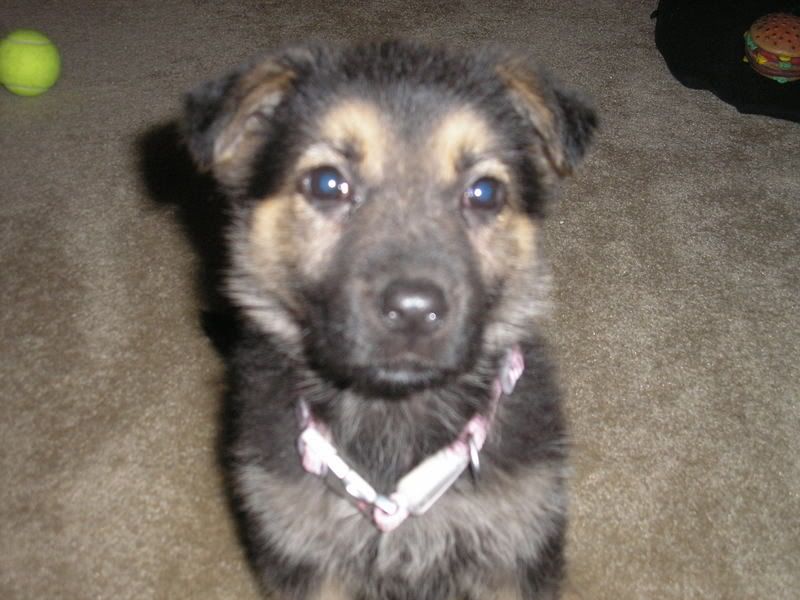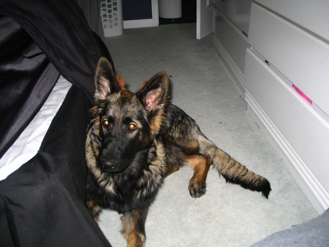 you should bring her to show n go to walk around. haha there were soo many dogs last year! goodluck though, and hold her while you can. i see BIG PAWS..they grow soo fast. my german shepherd is HUGE now... when she stands on her hind legs she's as tall as me.. and she's only a year.. the vet said she's still growing.. where did you get her?? the dad of my dog was one of the search and resue dogs in 911 and the mom was a drug sniffing dog... mines a longhair one . her name's abby but i call her bear.. since she's as big as one.. she likes to use her paws to hit people/shelby too... ![]() and her at like 4 months.. kinda dark buttt ![]()
