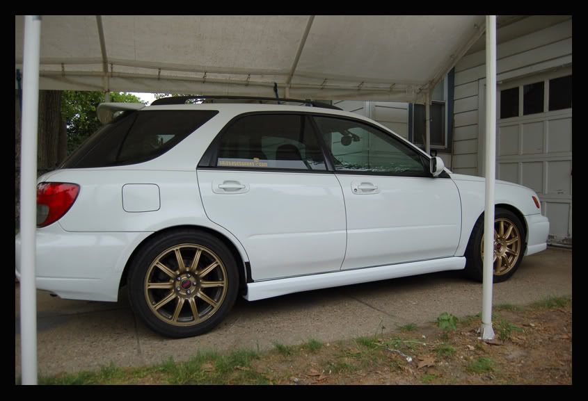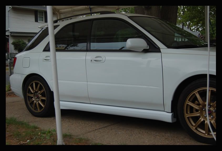 Looks awesome! I 2 wish they came that way. I especially hate the little black piece above the skirts. Im getting that painted and some kind of protection against paint chips done soon. I have the STI skirts but the lil black piece looks like crap on mine. The TST sticker wheels and pinstripe go great 2gether!!