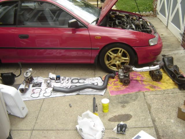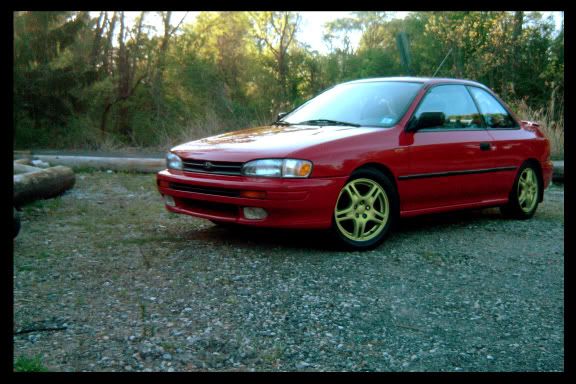 The last engine didnt last to long. This past weds. I got a smaller turbo, installed it and went out to tune. Well it didnt go well. Spun a bearing due to oil starvation etc. Friday night from 4pm to 4am myself, bryan (troll), and terry (gottalovethewagon) swapped in a new ej18 engine bought from Area1320. I am currently tuning it very conservatively. I don't need this one to blow up. Putting all efforts to building the JDM ej20g engine and converting my car to run with that. Update: 3/14/07 ![]() My red impreza is always evolving, usually when doing so I make it faster, this time I made it slower....ooops! The headgaskets that went in last time didnt do the trick, apparantly I warped the heads...who coulda thunk it! So I tore it down again and did it right. JDM wrx headgaskets, arp head studs, jdm wrx heads, sti turbo, etc etc. I am running all of this on a stock ecu with a piggyback so I am having trouble dialing it all in. Right now it runs fine but isnt making the power it can. New parts that are ON: ej20g heads arp head studs vf39 turbo tial 38mm wastegate QTP exhaust cutout 97+ hood (getting it tonight or tomorow) Update: 12/12/06 http://video.google.com/videoplay?do...03977910542226 So the headgaskets blew on 12/7 after racing MissDSM. On 12/9 I took the engine out and replaced the headgaskets with WRX ones. On 12/11 it started up and ran great. Currently running 13psi, looking to goto 15psi as soon as i get new plugs. Oh I also added sti injectors and took the rrfpr out. SO MUCH BETTER! Driving is soooooooo much smoother now, i officially will never use an rrfpr again after seeing how nice the car drives with bigger injectors and a tune. PICS: ![]() ![]() ![]() ![]() ++++++++++++++++++++++++++++++++++++++++++++++++++ +++++++++++++++++++ OLD PIC: take the fogs out and add a huge fmic and you got what it is now. ![]() Hmm where to start. I tear apart subarus, make them better, and put them back together...its what I do. I started off with a 96 automatic subaru, i made it look all nice and **** but that was when i was a ghey ricer and didnt know anything. Now like I said I tear apart subarus so i sold that heap and bought a 95 obd1 5spd impreza. 2k miles ago i tore out the engine, replaced the heads with larger ones and strapped a turbo kit to it. Suprisingly it runs quite well and is relatively fast considering what it came from. Stock- 18.xx @ 70mph (just a guess) Teh dirtified- 13.65 @ 99.31mph I have some big plans ahead of me. Looking for 400whp ultimately. Current Modifications: 10/30/06 ENGINE: ej18s block ej22 heads ej22 headgasket wrx exhaust manifold ERZ catless uppipe TD04 turbo HKS downpipe tial 38mm EWG QTP cutout WRX midpipe Custom Axleback JoeP Boost controller Custom FMIC 4:1 FMU ELECTRONICS: Greddy Emanage WRX 6-disc cd player SUSPENSION: RS struts H&R sport springs EXTERIOR: falling off bumper mod weight savings via paint scratches wrx wheels painted gold TST stickers