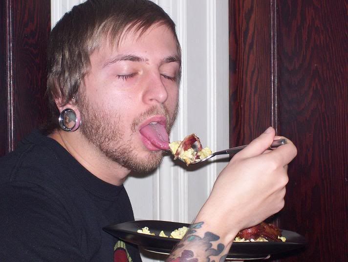 First I had to weave the bacon. (actually my girlfriend did it )![]() Then we cooked it. ![]() Then we added the cheese. ![]() Then we got REAL ****ing crazy and added scrambled eggs. ![]() Then we rolled it. ![]() Then I got a little intimate with my bacon roll...you knew I would. ![]() Then I slowly put that meat to my mouth and enjoyed it's juices!!! ![]() Jealous?
