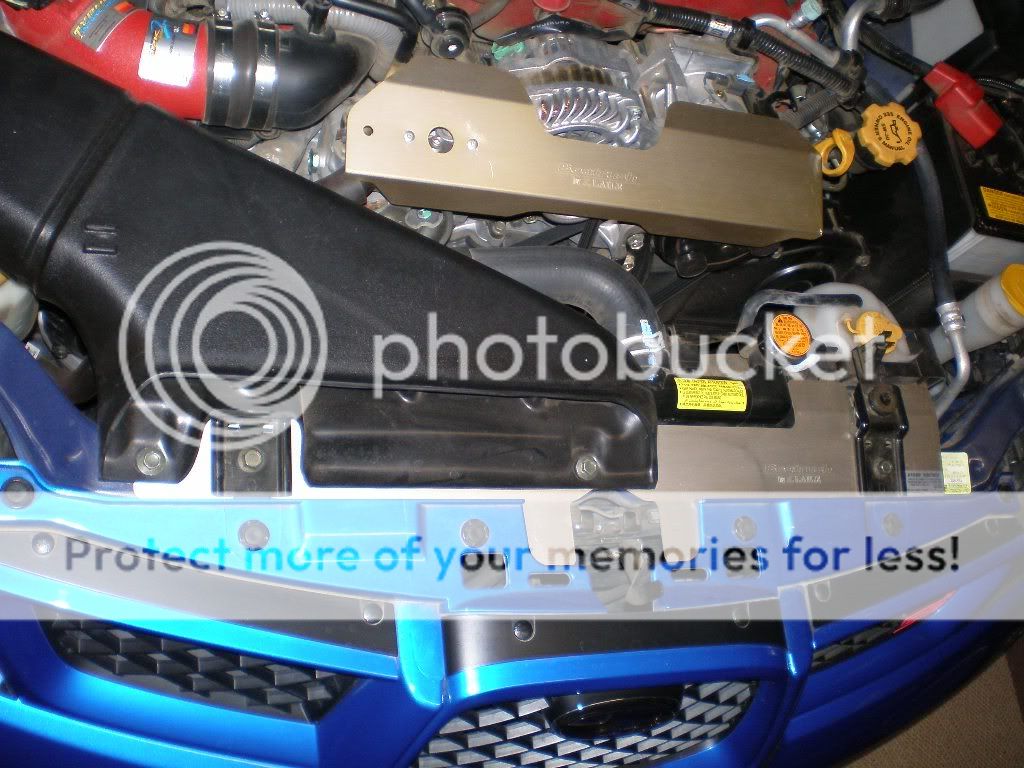 Tools required: Socket wrench, small extension, 10mm and 12mm socket, flat head screwdriver, floor jack, jack stands, allen wrench, pliers and knife to cut radiator hose or equivalent. ![]() Step 1: Jack up the car and put it on jack stands. Remove the under tray from the car to allow access to the radiator from underneath. Step 2: Remove the five 12mm bolts and the four pops. Step 3: Drain the radiator fluid by loosening the drain valve. Also, while under the vehicle, unclip the radiator fan plugs. Once the coolant is completely drained, remove the lower radiator hose completely to allow for trimming of lower radiator hose. (Trim ˝ inch from each side.) ![]() ![]() Step 4: Remove the top radiator brackets and the intake scoop. Then remove the top radiator hose clamps and hose completely. If they are left attached, they will interfere with the removal and installation of the new radiator. The scoop has two 10mm bolts, and the brackets have two 12mm bolts. ![]() Step 5: On the passenger side, remove two small radiator hoses and unclip the power steering line. Removing the power steering reservoir from the mounting bracket releases tension on hose. Note: You do NOT need to remove the reservoir clamps or the entire reservoir completely. Only unclip them from the mount on chassis. ![]() Step 6: Remove the radiator from the vehicle. Then remove the fans from the stock radiator, and reinstall them on the new Mishimoto radiator using the supplied hardware. Note: Do NOT use the original hardware to mount the fans on the new radiator. The OEM radiator used four 10mm screws, but the new hardware uses an allen key. ![]() Step 7: Install the new Mishimoto Radiator into the vehicle using the same steps as was used to remove the stock radiator but in reverse order. Install all of the hoses and clamps to their original positions on the new radiator. When installing the lower hose make sure to reconnect the radiator fan cables. ![]() Step 8: Install the zip ties on the coolant reservoir lines to ensure that they do not leak. Step 9: Reinstall the radiator brackets and intake scoop. Fill the radiator with coolant. Finally, install the Mishimoto Radiator Cap, and start car the car to check for leaks. ![]() ![]()