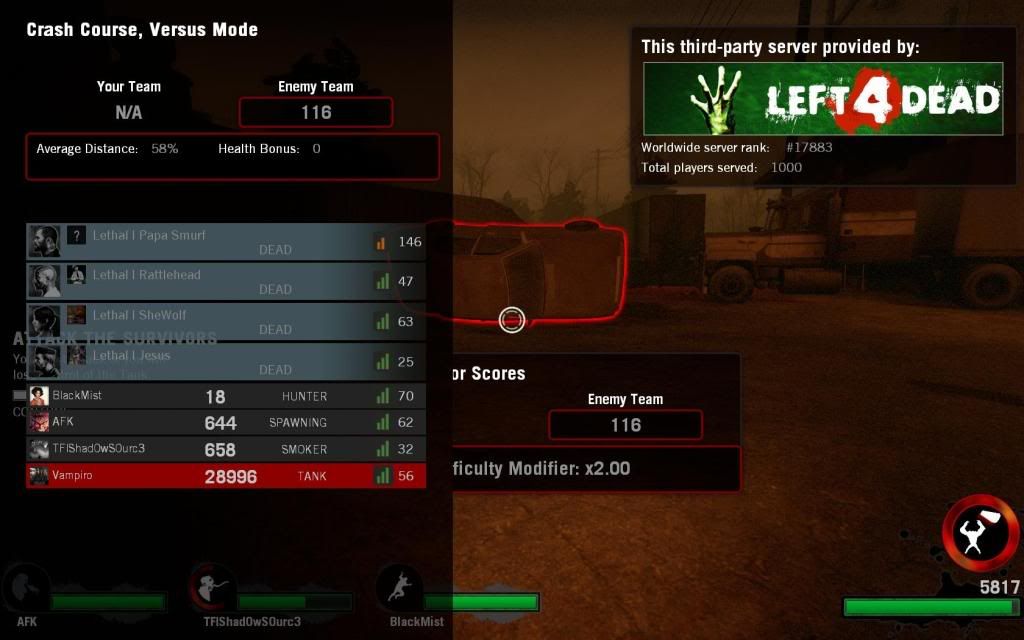 Seriously, 29,000 damage in 1 friggin map? Not even over the course of a campaign. Total ownage. I talked to Vampiro last night. He got the game a few days ago, and he missed the swing against shewolf, and smacked the car that killed us 3. Accidental death FTL. =(